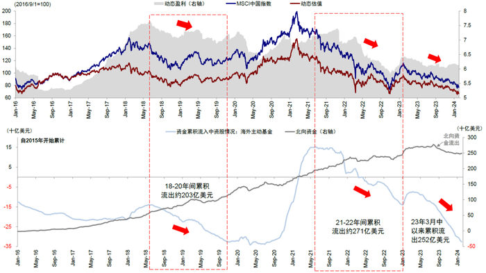 主动外资维持弱势,虽然速度有所放缓;近期欧洲资金为流出主力。整体看,EPFR口径下全球主动资金自去年3月中起维持弱势,目前已持续46周,虽然时长还不及2021年底至2022年底的59周与2018年中至2020年上旬的96周,但252.4亿美元的累积流出规模(含A股与海外中资股)已经超过2018年那一轮。进入2024年,海外资金维持流出,虽然速度有所放缓。分区域看,近期欧洲资金为流出主力,这一部分资金也恰好也是2023年初主要流入的资金。相比之下,由于美国资金当时流入不多,因此近期流出也不显著。