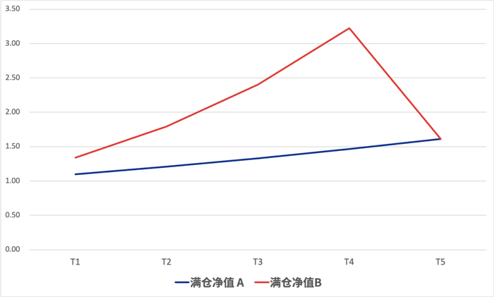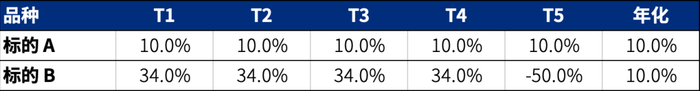 假设有两个标的,标的 A类似前几年的美股,每年稳定上升 10%,五年年化自然也是 10%。标的 B 类似做空波动性,许多年份都是大赚,比如下面的例子中就是每年 34%,但是最后一年崩盘腰斩,最后收益也是 10%。