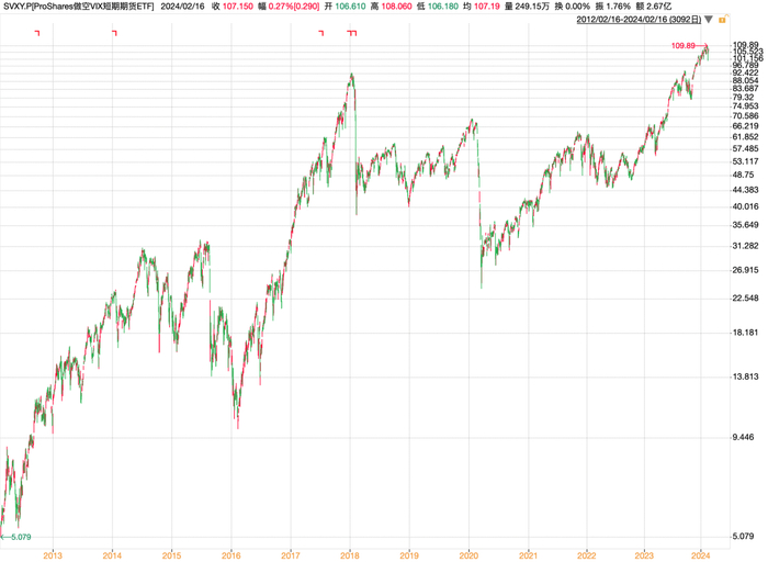 下图是执行做空波动率策略的 ETF 产品 SVXY自 2012 年以来的走势,可以看到涨幅喜人,但动不动腰斩的走势,也是很恐怖。我记得很早写过一篇分享,以及记得是一晚上可以亏 90%。