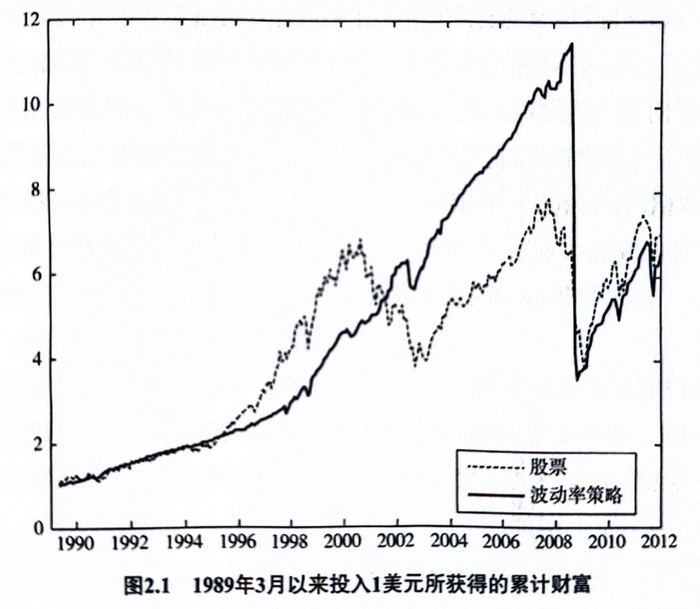 但这个策略,属于“黑天鹅”风格的。绝大多数年份,表现好的惊人,可谓是“躺赚”,但过个几年,总要来一波崩溃式暴跌。下图来自《资产管理:因子投资的系统性解释》一书,就是波动率策略与单纯持有美股的对比,虽然做空波动率曾经表现极为优异,但最后的暴跌,却让其和股票殊途同归。
