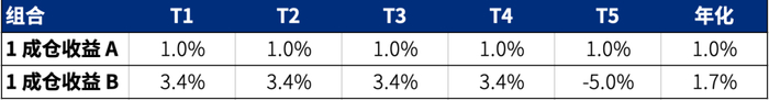 下图是两种组合的对比,你会发现在第五年持有标的 B 的组合虽然难逃腰斩,但对整个组合的亏损贡献只是 -5%,而之前四年连续贡献了 3.4%的正收益,所以五年下来年化收益1.7%,反而比一成仓位持有标的 A 的年化收益要表现好许多。