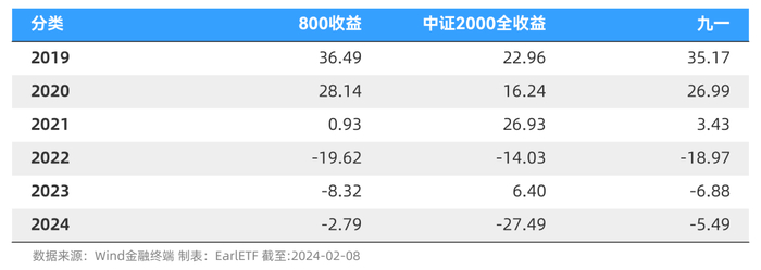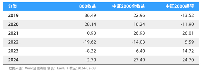 从下图可以看到,中证2000指数相比中证800指数,在收益分布上的确有不错的异质性,2019 年和 2020 年是跑输,但 2021 年到 2023 年优势显著跑赢,2024 年的数据是截止 2 月 8 日的,全年最终如何还难见分晓。