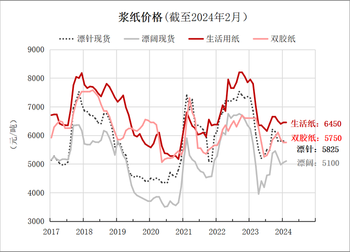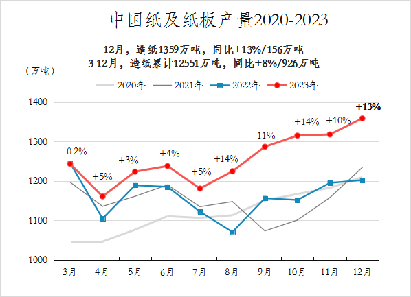 全年以来(2-12月,算上春节影响的2月份在内),造纸产量同比增加了802万吨,增速达到5.8%,超过国内经济发展速度,取得了较快的市场增长。如果将造纸产量简单理解为纸张终端的需求量(即生产出来的纸都是有终端需求去消化的,当然事实上可能并不是这样,因为生产出来的东西可能成为一定阶段内消化不了的库存),那么今年纸张需求的增加的原因或许包括:(1)纸张价格同比回落,低价驱动需求;(2)以纸替塑、生活纸用量同比继续带来增量;(3)国内消费同比温和复苏,提振纸张需求;(4)海外需求——据相关数据,2023年,我国生活纸出口112万吨,同比增加33万吨,双胶纸出口110万吨,同比增加22万吨。