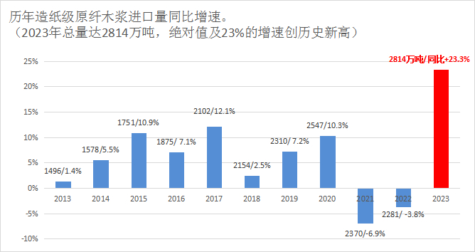 包括漂针、漂阔、本色、化机浆在内的原生木纤造纸浆全年进口量创历史新高,达到2814万吨,同比增加533万吨/+23%。