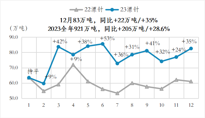 在造纸企业生产端不断提速修复的同时,今年全年供给端都体现了充裕的宽松度。12月同比增速继续扩大,尤其是阔叶浆,单月到港量同比大增65%/85万吨!