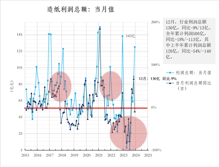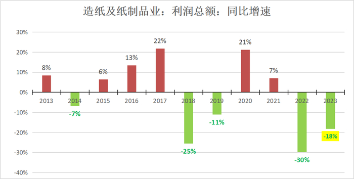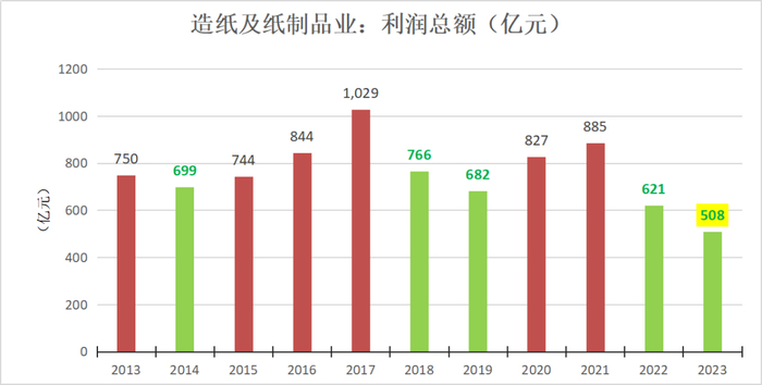 需要说明一下的是,这里通过621亿和508亿进行计算的结果得到2023年全年利润同比下滑18%的结论,而统计局发布的2023年全年造纸行业利润同比增长了4.4%,截至发表,笔者尚不能找到准确的差异的原因。