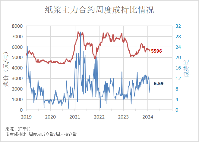 节前最后一周,纸浆主力合约SP2405下跌约42点至5570,震荡区间整体上连续几周较为一致,约5500-5700左右。由于临近春节,且最后一周只有四个交易日,导致周度成交量仅为130万手,大幅低于上上周。持仓量下降3万手左右,目前恢复至20万手以下。成持比环比继续下降,从8.8下降至6.6,交易活跃度下降,或体现盘面有较多的“套保为目的的实盘”成交。
