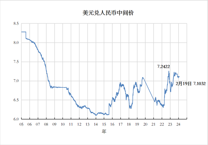美联储自2022年3月至2023年7月持续加息,联邦基金上限调至5.25%至5.5%。美国的最新非农就业数据表现大好,大幅超出市场预期,整体通胀局势得到控制,市场预期3月美国将开启降息。截止2024年2月19日,人民币暂未大幅反弹,连续数周收平于7.1附近,这或许与中美高额的利差有关系,一方面美元降息并未真正开启,只是预期,另一方面,年前人民币存款利率进一步下调,以及前两周存款准备金率宣布下调将使得货币供给增加,均给人民币的估值带来压力。