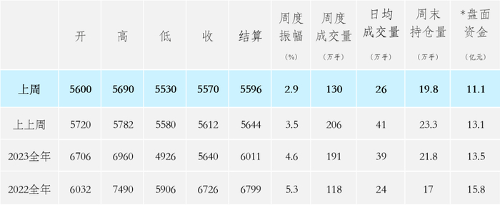 2402合约交割价环比变化不大,下降10元至5596元,合约交易量为7.6万吨。