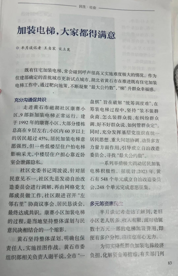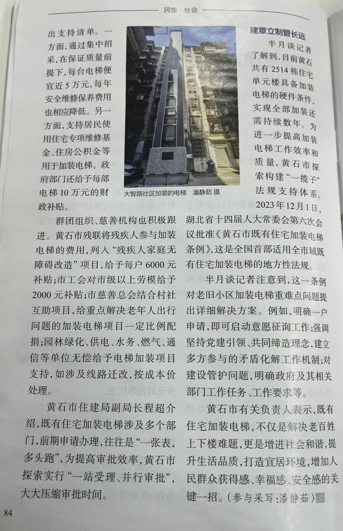 《半月谈》聚焦黄石老旧小区电梯加装