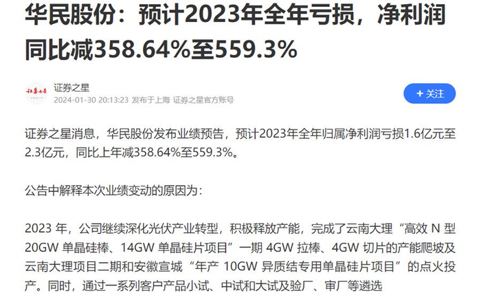 华民股份也回应称,这是由于光伏行业的市场走势波动大,硅料、硅片的价格持续下滑所导致的。