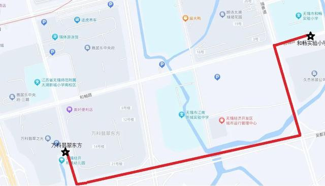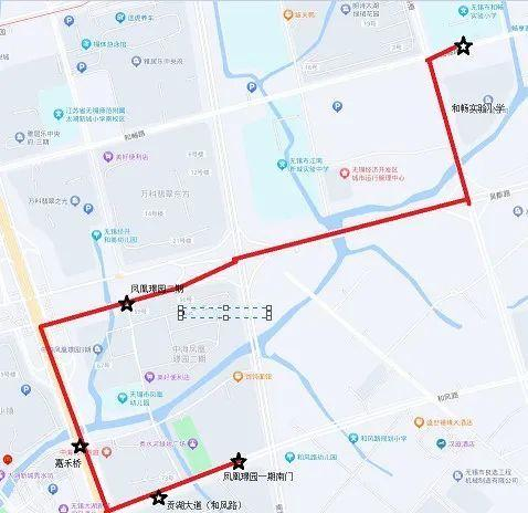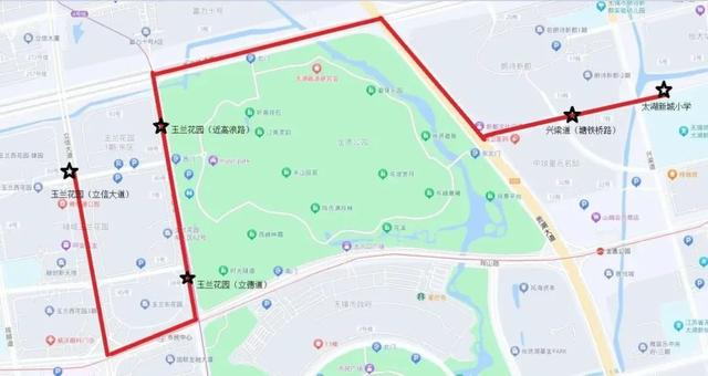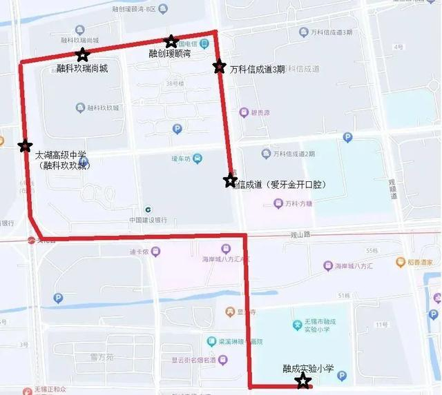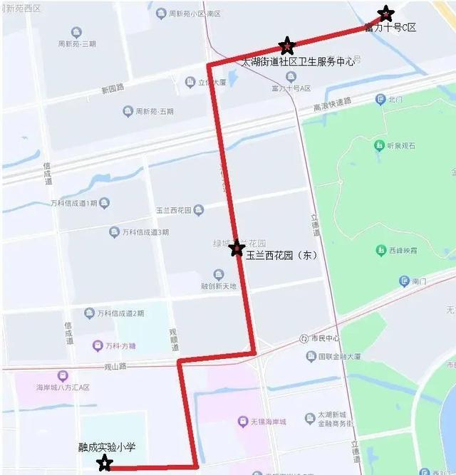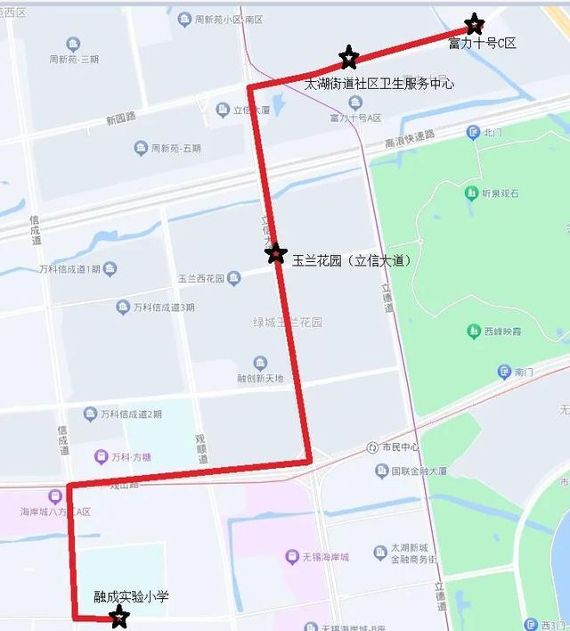 线路走向:上午由贡湖苑(信成道)始发,经信成道、具区路、南湖大道、清源路、瑞景道到达太湖实验小学(南侧专用道闸),下午原路返回。