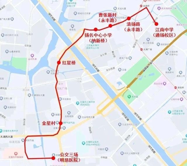 线路走向:由公交三场(明慈医院)出发,沿中南路、湖滨路、太湖大道、红星路、永丰路、清扬路、太湖大道、通扬路,到达扬名新村(通扬路)。
