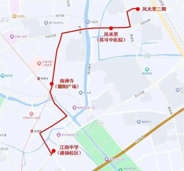 放学时段:由东绛第二实验学校出发,经章村路、梁东路、南湖大道、大通路、信成道、锡南路,到达锡南路公交站点。