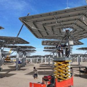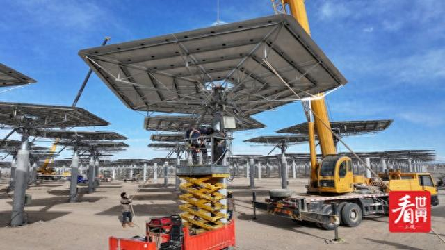 题图说明:工程技术人员在安装“光热+光伏”试点项目的定日镜。