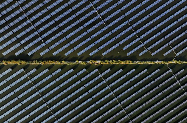 山坡上一排排蓝色的光伏板在阳光照射下源源不断地输送着绿色能源。