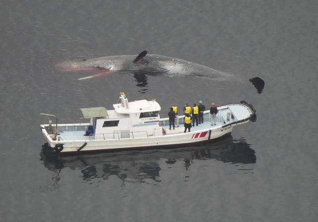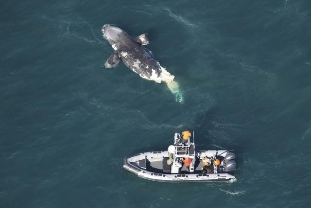 美国佐治亚州泰比岛附近海域,工作人员驾驶船只靠近死鲸。新华社/美联