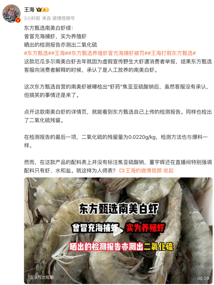 东方甄选回应后,王海再次发布微博称:曾冒充海捕虾,实为养殖虾,晒出的检测报告亦测出二氧化硫。这款厄瓜多尔南美白虾去年就因为虚假宣传野生大虾遭消费者举报,结果东方甄选客服向消费者解释的时候,承认了是人工放养的南美白虾。