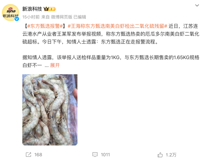 2月20日,东方甄选报警一事引发热议。近日,知名打假人王海发布视频称,东方甄选自营厄瓜多尔南美白虾隐瞒添加并超量使用焦亚硫酸钠,涉嫌欺诈消费者。2月19日下午,知情人士称,东方甄选正在走报警流程,该举报人送检样品重量为1公斤,与东方甄选售卖的1.65公斤规格白虾不一致,有可能送检样品并非东方甄选产品。