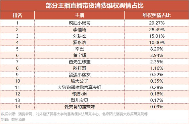 2022年,一项关于直播带货消费维权舆情的调查数据显示,在被选入研究的对象中,涉及疯狂小杨哥的维权舆情最多,占比高达29.27%;其次是李佳琦,占比28.49%;排名第三的刘畊宏则占比15.01%。在销售额增长的同时,各大主播2022年的客诉相比2021年均有不同增长,这些数据似乎表明,影响力与客诉压力成正比。