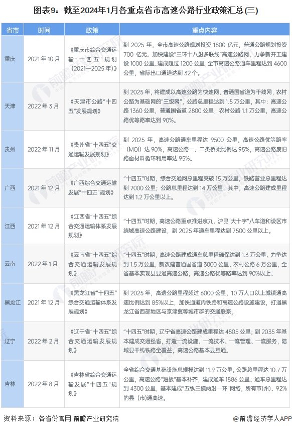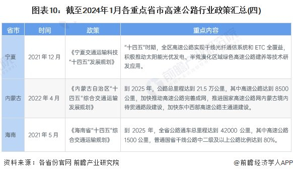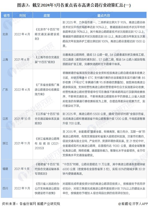 地方政府层面,为了响应国家号召,各省市积极印发有关政策通知推动高速公路行业的发展。截至2024年1月,各重点省市高速公路行业的相关政策汇总如下: