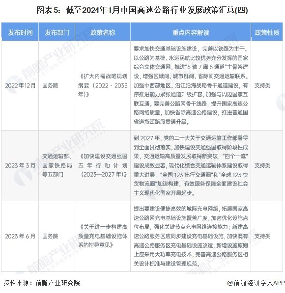 国家较为重视对于公路建设的规划与实施,全国基础建设进程的逐步推进利好我国高速公路建设行业整体发展。截至2024年1月,我国高速公路行业重点发展政策汇总如下: