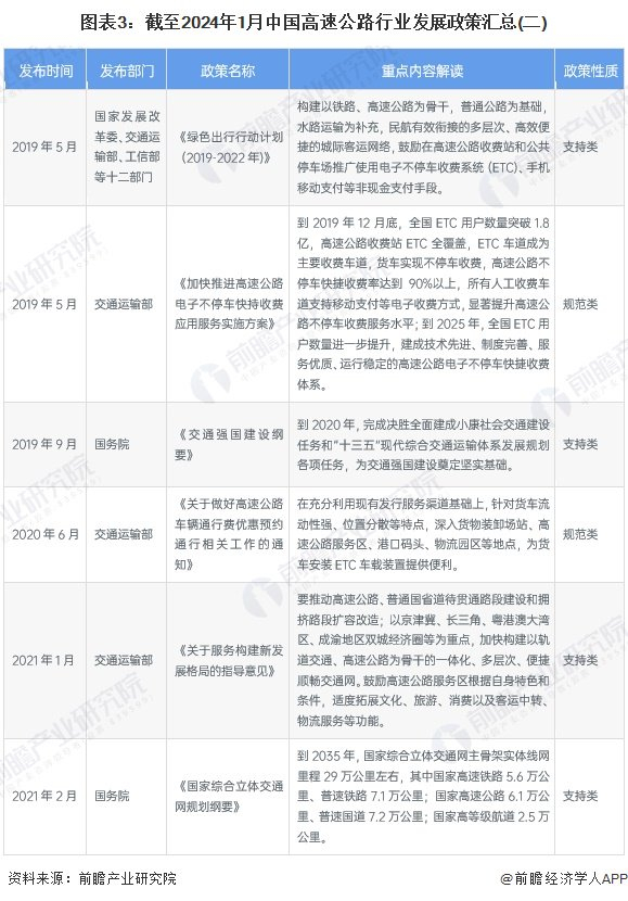 2021年12月,国务院发布了《“十四五”现代综合交通运输体系发展规划》,对“十四五”时期构建现代综合交通运输体系工作作出顶层设计和系统部署,其中,对于高速公路行业提出:要加快推进国家高速公路贯通互联,持续推进国家高速公路繁忙通道扩容改造,积极完善城市群都市圈快速网络,有序推进特大城市和城市群核心城市绕城高速、城市出入口路段、互通式立交等建设改造,并对战略性通道及地方高速公路建设等作出部署;到2025年,全国高速公路建成里程将达19万公里。