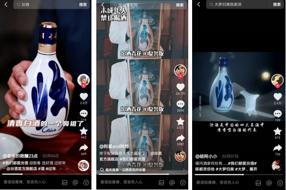 @吃货老外铁蛋儿@酒叔尝白酒@胡阿小小@阿星and阿奇@沐酥酥@黑哥好酒@安森的话事酒馆@老宋的微醺23点@失野晶@干饭小困困等横跨酒水、美食、搞笑、剧情领域的博主也都积极参与#我们都爱汾酒 抖音挑战赛,用创意创新的视频展现对汾酒的青睐。