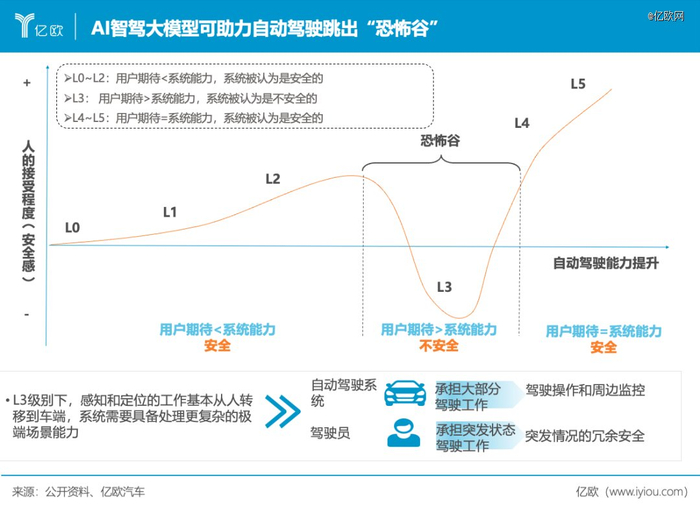 亿欧智库认为,自动驾驶也正从低阶向高阶进发,但发展过程中,鉴于用户期望与系统能力的不匹配,在从L2迈入L3后,会形成“恐怖谷”,存在一定的挑战,而随着智驾大模型的应用和部署,将会助力自动驾驶跳出“恐怖谷”。亿欧智库预测,2024年,在数据驱动下,智驾大模型将进一步促进高阶自动驾驶功能落地量产。
