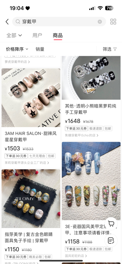 穿戴甲作为美甲行业的一大分支在美甲业崭露头角,并快速占领市场。某电商平台上,穿戴甲的价格从几元钱到上千元不等,价格的差异也对应了供需差异。