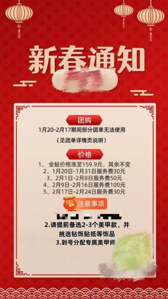 谈及春节期间收取服务费的问题,广州某美甲店店主向时代周报透露,过年期间用人成本变高,增加的服务费一部分是美甲师的加班费。“每年春节期间顾客最多,是一年一度的黄金期,顾客数量是平时的好几倍。相应的,我们收益较平时有所增加。”上述店主说到。