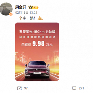 比亚迪刚宣布出“王炸”不久,上汽通用五菱品牌事业部副总经理周钘在社交媒体发布了只有四个字的动态,“一个字,跟!”并附上了一张写有“五菱星光150km进阶版荣耀价9.98万元”的图片,五菱决定紧跟比亚迪降价的意图显而易见。