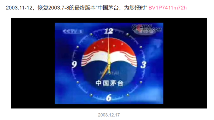 2002:未来的白酒王者——贵州茅台终于露脸。这一年,茅台开始投放中央电视台晚上7点的《新闻联播》报时广告。一开始的广告语是:“国酒茅台,民族精品,为您报时!”后来定型为解说词:“中国茅台,为您报时!”茅台集团当时的领导,眼光敏锐,在国人最关注的《新闻联播》前那几秒最黄金的时间,推出这个广告,十几年坚持不变,从而让茅台家喻户晓,成为国人心中根深蒂固的“国酒”。