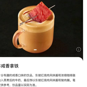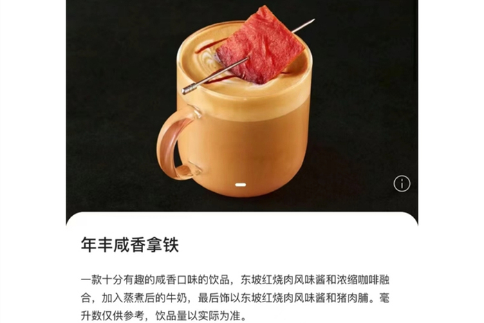 所谓的“红烧肉拿铁”其实是星巴克推出的一款新品——“年丰咸香拿铁”。在该商品详情页显示,其由“东坡红烧肉风味酱和浓缩咖啡融合,加入蒸煮后的牛奶,最后饰以东坡红烧肉风味酱和猪肉脯”,售价68元。