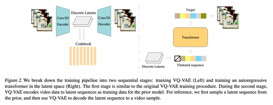 这篇论文提出的 VideoGPT 可用于扩展基于似然的生成对自然视频进行建模。Video-GPT 将通常用于图像生成的 VQ-VAE 和 Transformer 模型以最小的修改改编到视频生成领域,研究者利用 VQVAE 通过采用 3D 卷积和轴向自注意力学习降采样的原始视频离散潜在表示,然后使用简单的类似 GPT 的架构进行自回归,使用时空建模离散潜在位置编码。VideoGPT 结构下图:
