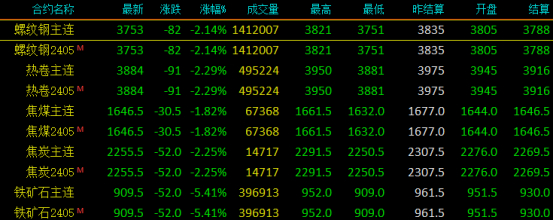 随着铁矿石及双焦强势下拉,螺纹钢和热卷也坚持不住下跌近100点,螺纹钢及热卷期货主力分别下探3751点和3881点,均创三个半月新低。大商所铁矿石期货跌超5%,报909.5元/吨。新加坡铁矿石指数期货跌4.82%,报121.25美元/吨。
