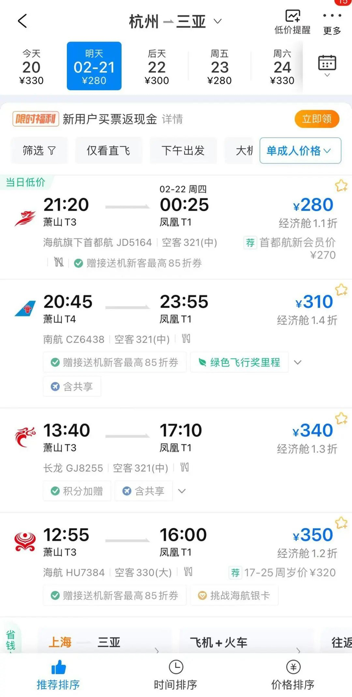 携程平台查询显示,从2月20日至2月底,从上海、北京、广州等地飞三亚有1至2折低价机票,最低0.7折约280元。从杭州、成都、重庆等城市飞三亚,将从2月下旬开始可以买到2折左右低价机票。