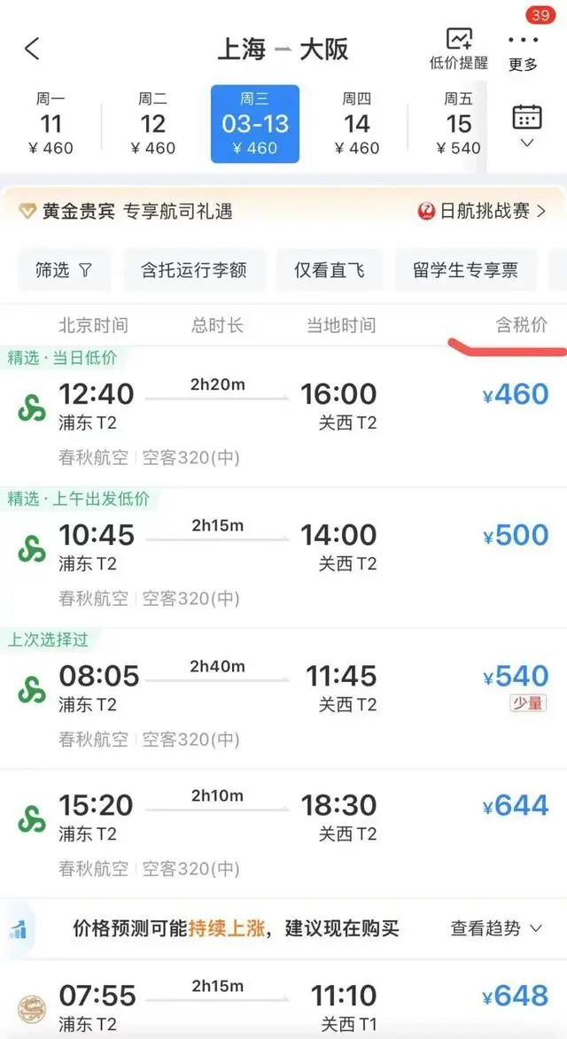 2月19日,有网友发现,购买3月中旬从上海浦东国际机场飞往日本大阪关西国际机场的机票,只要8到11元不等。