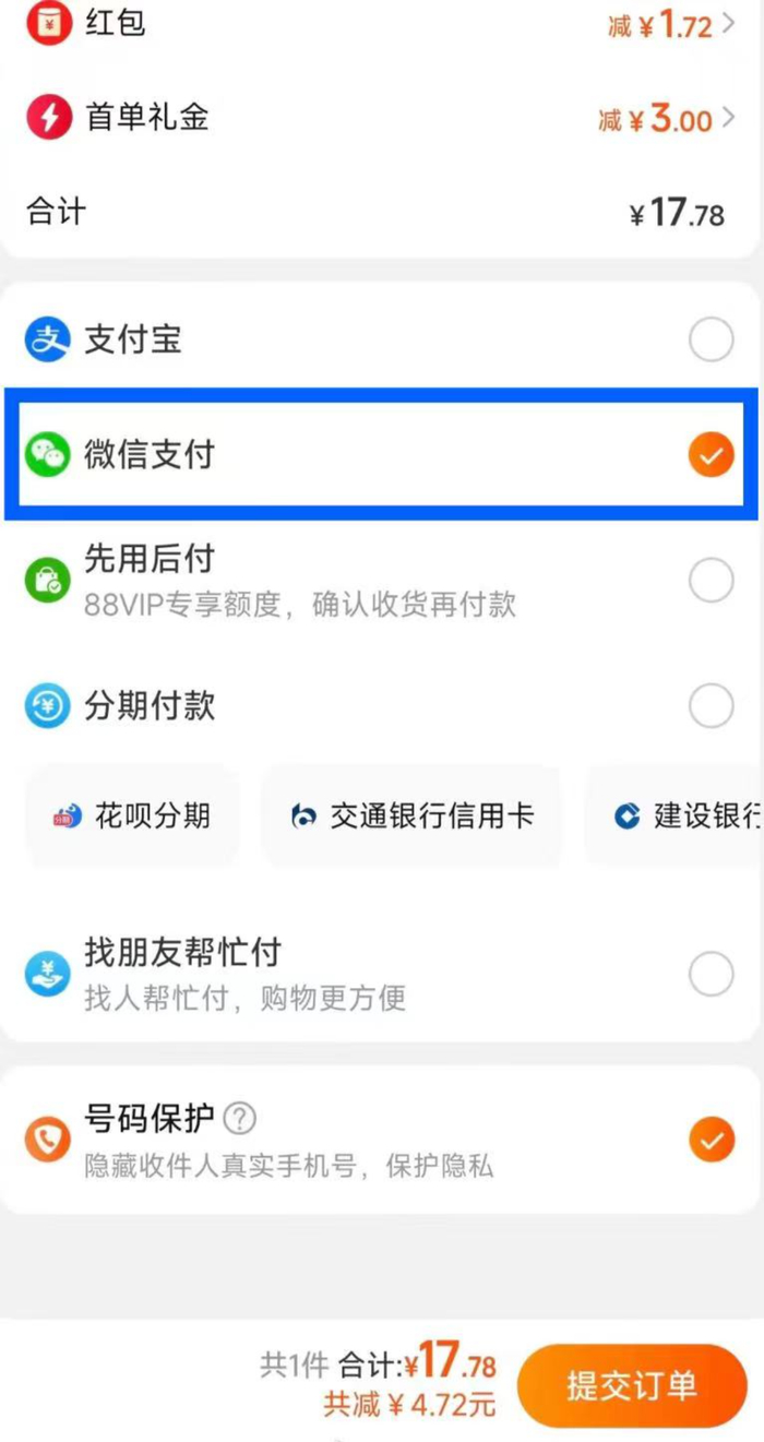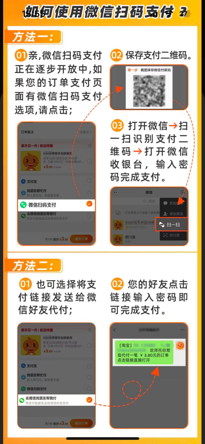 根据当时淘宝客服反馈的信息,要想在淘宝完整使用微信扫码支付,可以通过淘宝给出的二维码图片进行微信扫码支付,但不支持自动跳转至微信进行支付;“去微信找朋友帮我付”,用户可以复制链接发送给微信好友进行支付。
