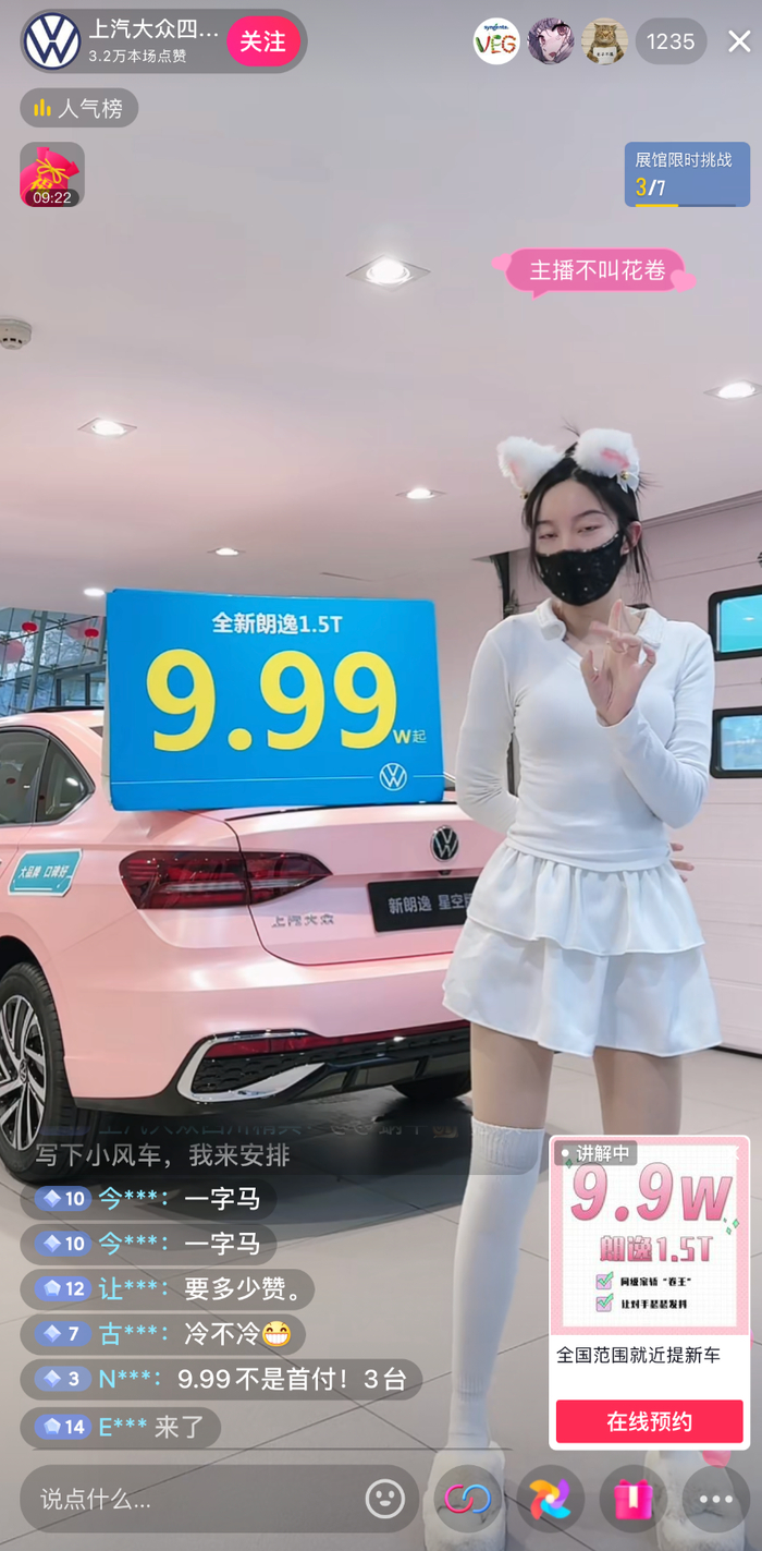 早上10点还不到,上汽大众四川某4S店直播间同时在线人数已达到1100人。屏幕前,戴着黑色口罩的女主播小琪一身超短白色“战袍”,站在一辆9.99万元的朗逸面前,以飞快的语速掌控全局: