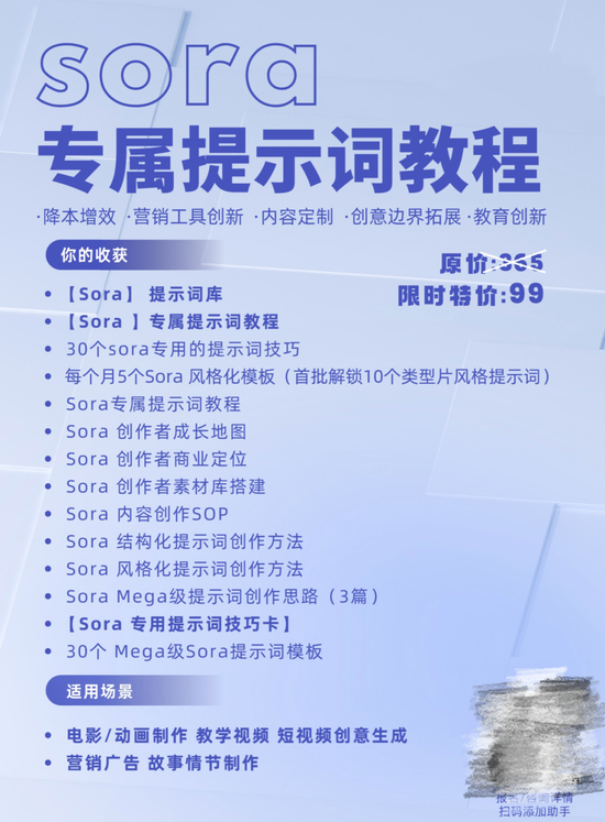 2月18日,某自称为“执剑人”博主推出了原价365,现价99的《Sora一键文生视频》的课程,称要教会学员如何使用Sora专属提示词库,Sora提示词技巧,该课程可以拓展教育边界、降本增效、创新教育方式。