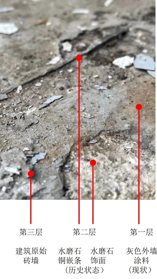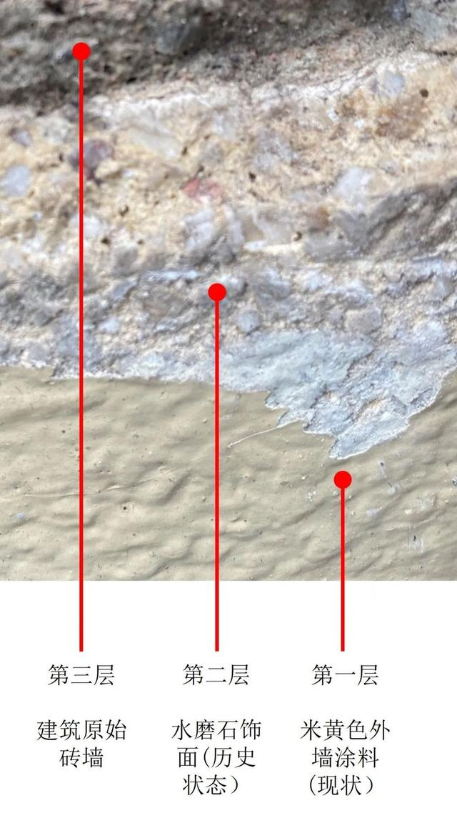 经过考证,建筑原外立面墙体为黄沙水泥色外墙,建筑现在为拉毛墙面,外刷米黄色涂料,本次修缮需铲除现状建筑外立面黄色涂料,如局部存有空鼓细裂缝等现象,则采用注浆粘结及渗透增强的方法进行修理。