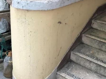 思南路46号住宅的入口处挡墙原为水磨石材质,后表面覆盖有粉刷涂料,水磨石踏步、地坪等均出现开裂、污损的情况。