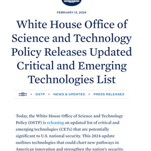 2024年2月,美国国家科学技术委员会(NSTC)发布了新一版关键和新兴技术(Critical and emerging technologies, CETs)清单。CETs清单以美国2020年发布的《关键和新兴技术国家战略》为基础,每两年更新一次关键和新兴技术领域列表,及各领域内的具体技术清单。