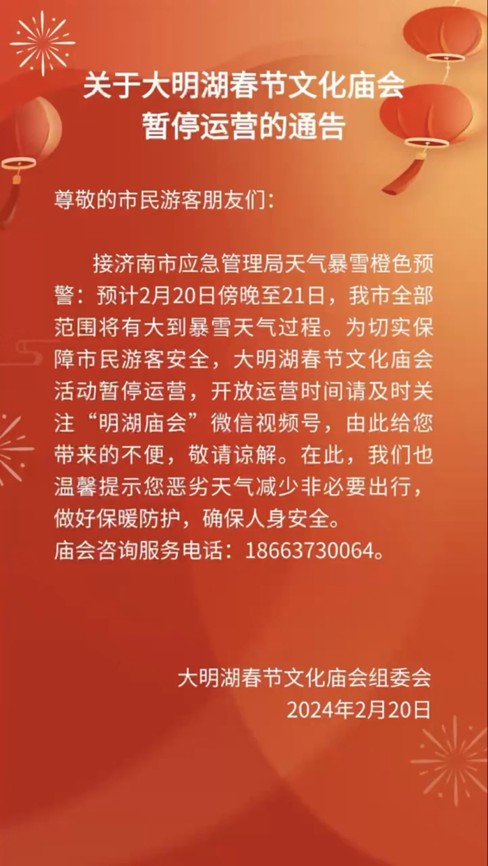大明湖新春文化庙会暂停运营,开放运营时间请关注“明湖庙会”微信视频号。
