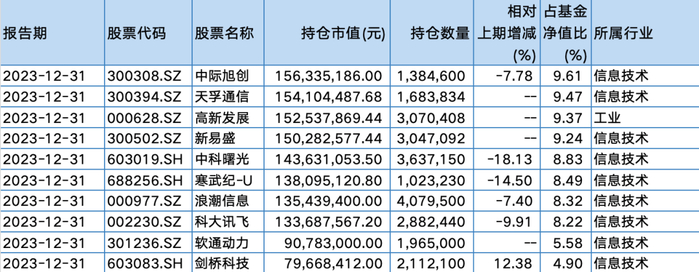 具体来看,在2023年四季度,公募老将、中欧基金基金经理周蔚文旗下三只产品均增持了中际旭创,其中中欧新蓝筹A增持196.19万股,中欧新趋势A增持138.17万股,中欧精选A增持107.29股。