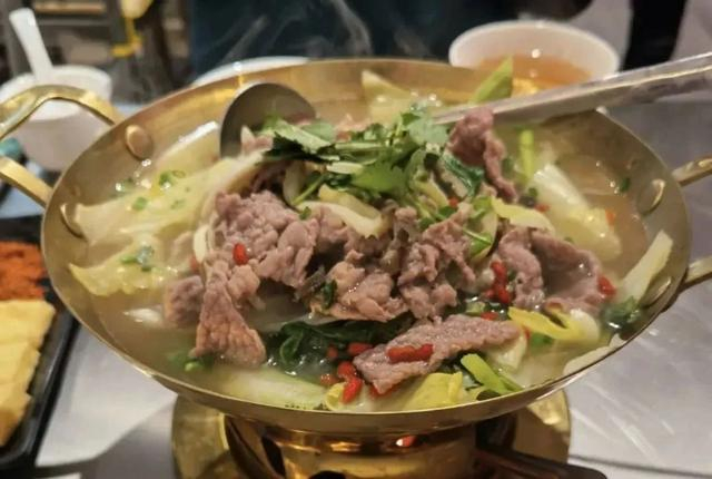 跷脚牛肉分量很足,卷心菜上堆叠着牛肉牛杂,出锅前在药材熬制的高汤里洒一把香菜和小葱,香味四溢。吃之前先喝一碗清汤,暖胃之后,再将牛肉在干辣椒蘸碟上均匀地滚上一圈,入口先辣后鲜,肉质嫩滑、酥烂,无比满足。