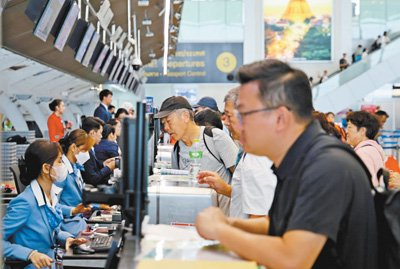 春节期间,中国游客在泰国曼谷素万那普机场办理登机手续。