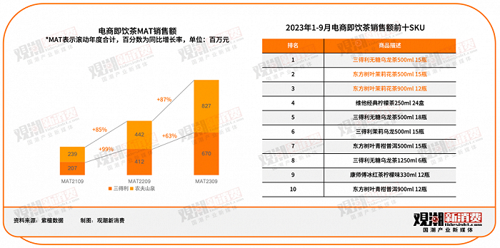 根据紫檀数据,截至2023年第三季度的过去12个月里,农夫山泉在即饮茶领域实现了8.27亿元的电商销售额,超过了三得利的6.7亿元。从单品销售情况来看,东方树叶的茉莉花茶(500ml和900ml版本)和三得利的乌龙茶是2023年1-9月电商即饮茶品类中仅有的三支亿元级SKU。