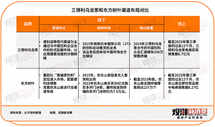 背靠农夫山泉也为东方树叶产品覆盖全国市场打下了坚实的基础。农夫山泉的茶π、NFC等面向一二线城市;农夫果园、尖叫等面向三四线市场,同时依托矿泉水、饮料等多产品矩阵的布局,让品牌在与经销商、线下门店甚至更小的街边夫妻店谈判货架空间时,掌握了更多主动权。截至2022年底,农夫山泉经销商数量约4500个,全国终端零售网点237万个,这个数字远远超过三得利的布局。